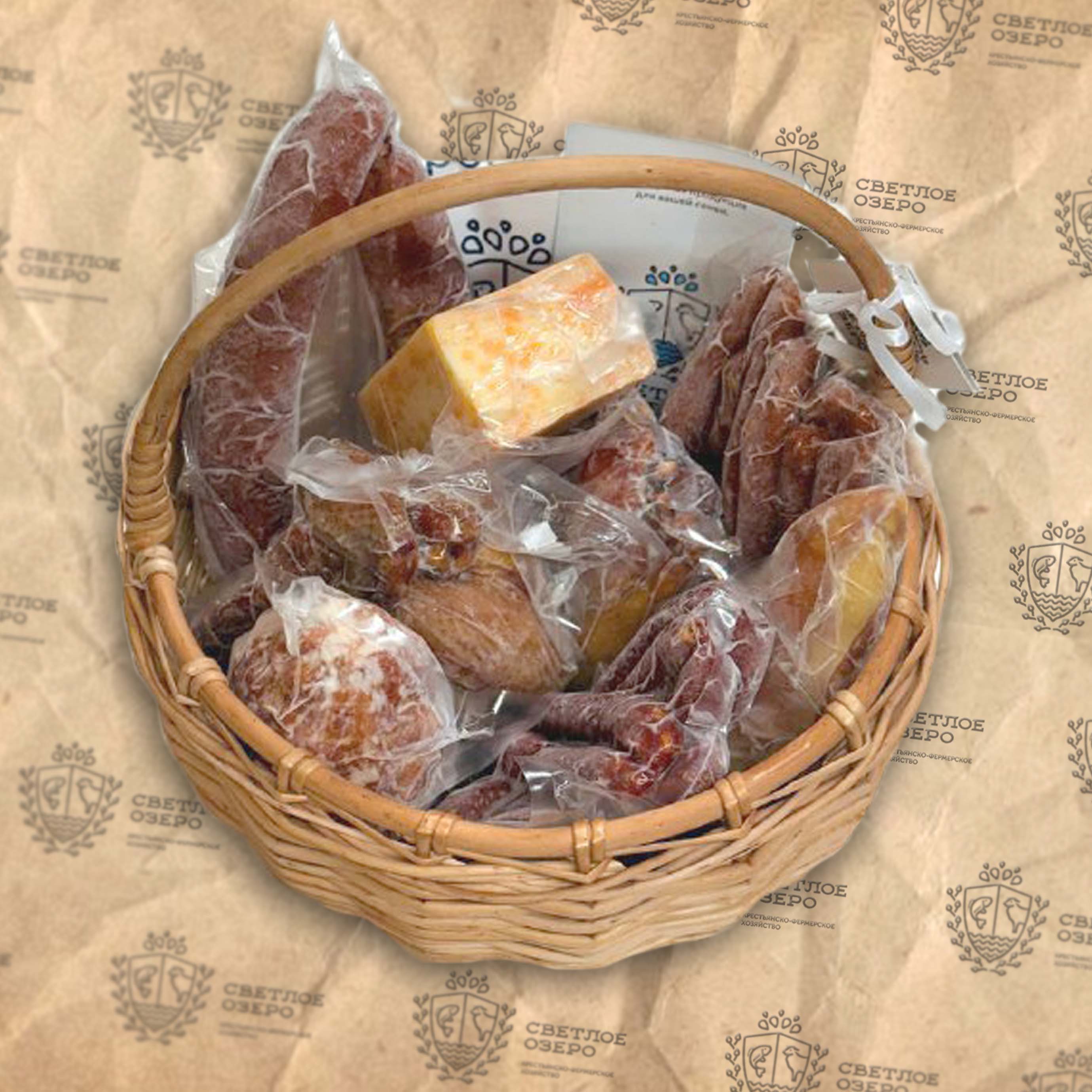 Состав корзины: колбаса фермерская, рулет из мяса птицы, козляносси, сыр в ассортименте.